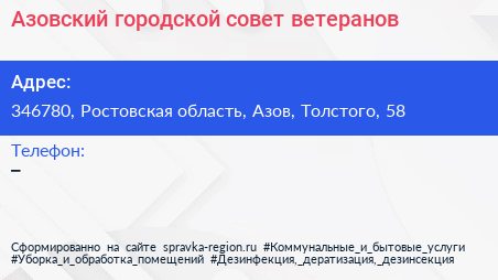 Азовский городской совет ветеранов по адресу 346780, Ростовская область, Азов, Толстого, 58 в дальнейшем Организация, размещена в следующих категориях: