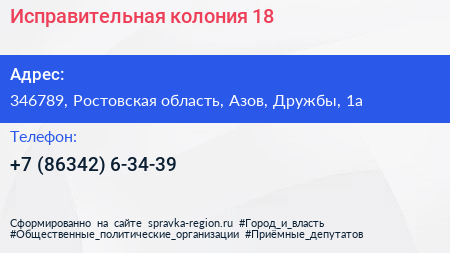 Исправительная колония №18 по адресу 346789, Ростовская область, Азов, Дружбы, 1а в дальнейшем Организация, размещена в следующих категориях: