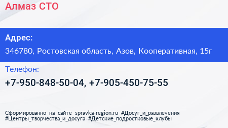 Алмаз, СТО по адресу 346780, Ростовская область, Азов, Кооперативная, 15г в дальнейшем Организация, размещена в следующих категориях: