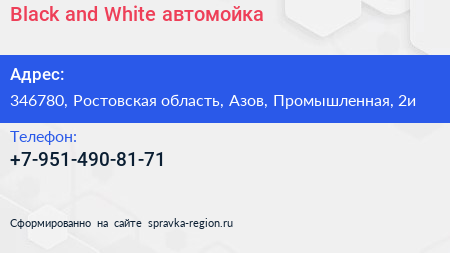 Black and White, автомойка по адресу 346780, Ростовская область, Азов, Промышленная, 2и в дальнейшем Организация, размещена в следующих категориях: