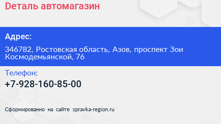 Dеталь, автомагазин по адресу 346782, Ростовская область, Азов, проспект Зои Космодемьянской, 76 в дальнейшем Организация, размещена в следующих категориях: