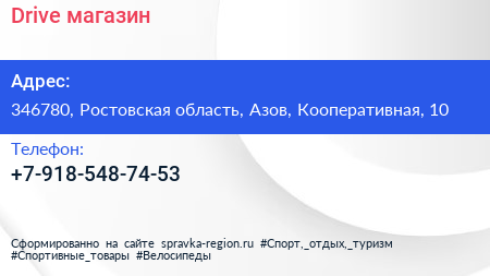 Drive, магазин по адресу 346780, Ростовская область, Азов, Кооперативная, 10 в дальнейшем Организация, размещена в следующих категориях: