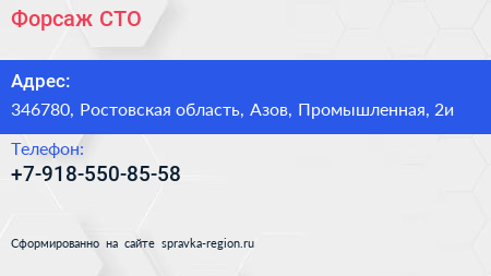 Форсаж, СТО по адресу 346780, Ростовская область, Азов, Промышленная, 2и в дальнейшем Организация, размещена в следующих категориях: