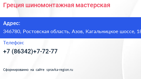 Греция, шиномонтажная мастерская по адресу 346780, Ростовская область, Азов, Кагальницкое шоссе, 18 в дальнейшем Организация, размещена в следующих категориях: