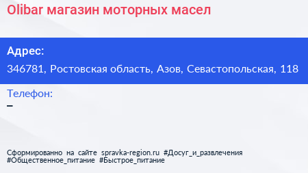 Olibar, магазин моторных масел по адресу 346781, Ростовская область, Азов, Севастопольская, 118 в дальнейшем Организация, размещена в следующих категориях: