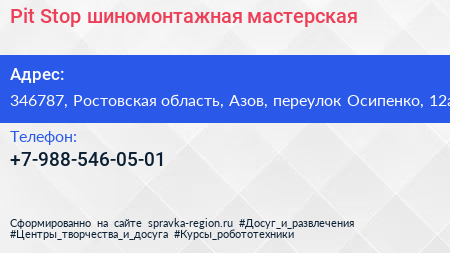 Pit Stop, шиномонтажная мастерская по адресу 346787, Ростовская область, Азов, переулок Осипенко, 12а в дальнейшем Организация, размещена в следующих категориях: