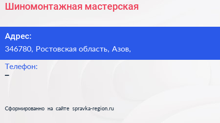 Шиномонтажная мастерская по адресу 346780, Ростовская область, Азов, в дальнейшем Организация, размещена в следующих категориях: