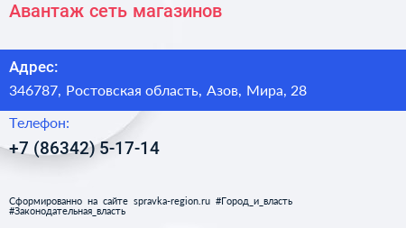 Авантаж, сеть магазинов по адресу 346787, Ростовская область, Азов, Мира, 28 в дальнейшем Организация, размещена в следующих категориях: