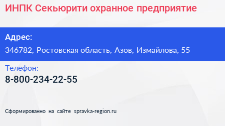 ИНПК Секьюрити, охранное предприятие по адресу 346782, Ростовская область, Азов, Измайлова, 55 в дальнейшем Организация, размещена в следующих категориях: