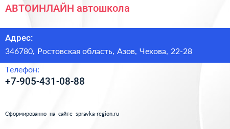 АВТОИНЛАЙН, автошкола по адресу 346780, Ростовская область, Азов, Чехова, 22-28 в дальнейшем Организация, размещена в следующих категориях:
