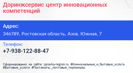 Доринжсервис, центр инновационных компетенций по адресу 346789, Ростовская область, Азов, Южная, 7 в дальнейшем Организация, размещена в следующих категориях: