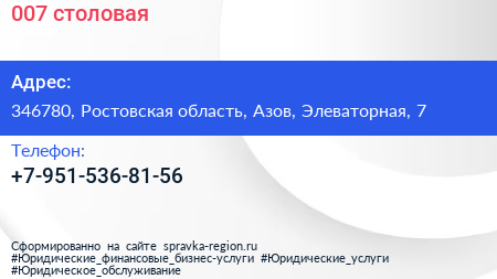 007, столовая по адресу 346780, Ростовская область, Азов, Элеваторная, 7 в дальнейшем Организация, размещена в следующих категориях:
