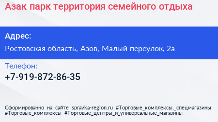 Азак-парк, территория семейного отдыха по адресу Ростовская область, Азов, Малый переулок, 2а в дальнейшем Организация, размещена в следующих категориях: