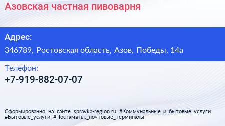 Азовская частная пивоварня по адресу 346789, Ростовская область, Азов, Победы, 14а в дальнейшем Организация, размещена в следующих категориях: