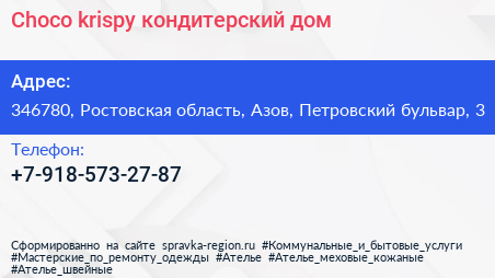 Choco krispy, кондитерский дом по адресу 346780, Ростовская область, Азов, Петровский бульвар, 3 в дальнейшем Организация, размещена в следующих категориях:
