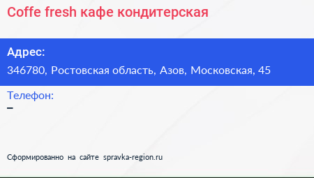 Coffe fresh, кафе-кондитерская по адресу 346780, Ростовская область, Азов, Московская, 45 в дальнейшем Организация, размещена в следующих категориях: