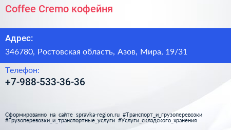Coffee Cremo, кофейня по адресу 346780, Ростовская область, Азов, Мира, 19/31 в дальнейшем Организация, размещена в следующих категориях: