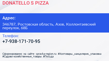 DONATELLO`S PIZZA по адресу 346787, Ростовская область, Азов, Коллонтаевский переулок, 68Б в дальнейшем Организация, размещена в следующих категориях: