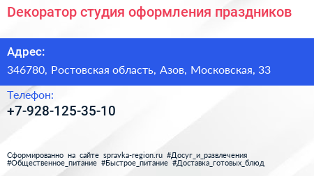 Dекоратор, студия оформления праздников по адресу 346780, Ростовская область, Азов, Московская, 33 в дальнейшем Организация, размещена в следующих категориях: