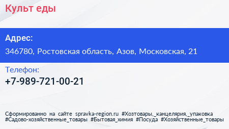 Культ еды по адресу 346780, Ростовская область, Азов, Московская, 21 в дальнейшем Организация, размещена в следующих категориях: