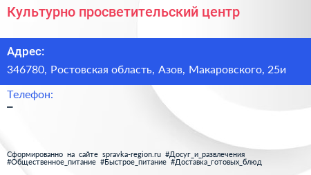 Культурно-просветительский центр по адресу 346780, Ростовская область, Азов, Макаровского, 25и в дальнейшем Организация, размещена в следующих категориях: