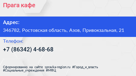 Прага, кафе по адресу 346782, Ростовская область, Азов, Привокзальная, 21 в дальнейшем Организация, размещена в следующих категориях: