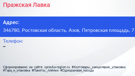 Пражская Лавка по адресу 346780, Ростовская область, Азов, Петровская площадь, 7 в дальнейшем Организация, размещена в следующих категориях: