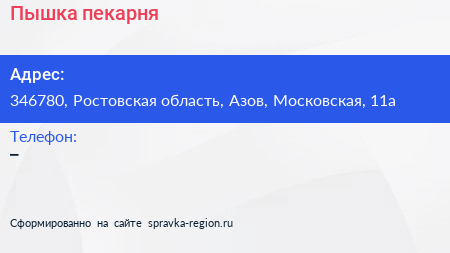 Пышка, пекарня по адресу 346780, Ростовская область, Азов, Московская, 11а в дальнейшем Организация, размещена в следующих категориях: