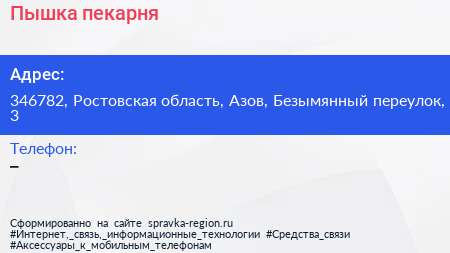 Пышка, пекарня по адресу 346782, Ростовская область, Азов, Безымянный переулок, 3 в дальнейшем Организация, размещена в следующих категориях: