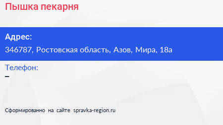 Пышка, пекарня по адресу 346787, Ростовская область, Азов, Мира, 18а в дальнейшем Организация, размещена в следующих категориях: