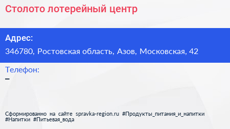 Столото, лотерейный центр по адресу 346780, Ростовская область, Азов, Московская, 42 в дальнейшем Организация, размещена в следующих категориях: