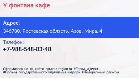 У фонтана, кафе по адресу 346780, Ростовская область, Азов, Мира, 4 в дальнейшем Организация, размещена в следующих категориях: