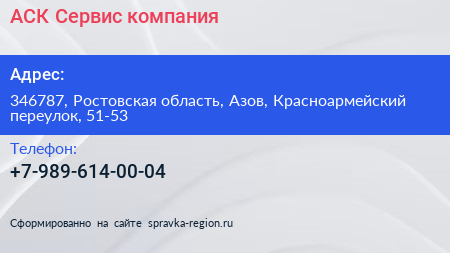 АСК Сервис, компания по адресу 346787, Ростовская область, Азов, Красноармейский переулок, 51-53 в дальнейшем Организация, размещена в следующих категориях: