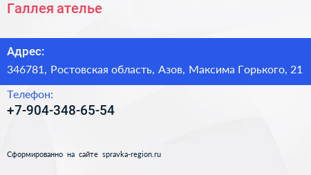 Галлея, ателье по адресу 346781, Ростовская область, Азов, Максима Горького, 21 в дальнейшем Организация, размещена в следующих категориях: