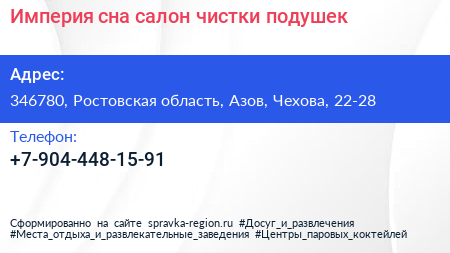 Империя сна, салон чистки подушек по адресу 346780, Ростовская область, Азов, Чехова, 22-28 в дальнейшем Организация, размещена в следующих категориях: