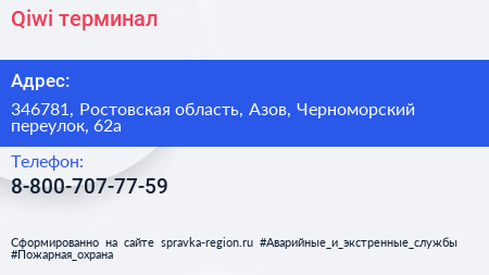 Qiwi, терминал по адресу 346781, Ростовская область, Азов, Черноморский переулок, 62а в дальнейшем Организация, размещена в следующих категориях: