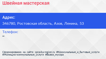 Швейная мастерская по адресу 346780, Ростовская область, Азов, Ленина, 53 в дальнейшем Организация, размещена в следующих категориях: