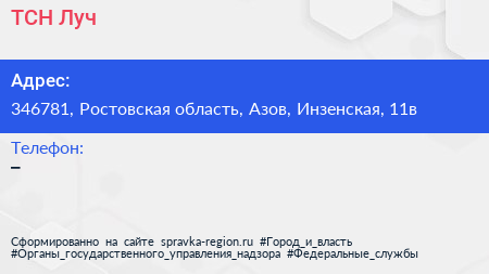 ТСН Луч по адресу 346781, Ростовская область, Азов, Инзенская, 11в в дальнейшем Организация, размещена в следующих категориях: