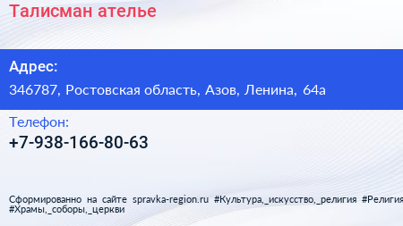 Талисман, ателье по адресу 346787, Ростовская область, Азов, Ленина, 64а в дальнейшем Организация, размещена в следующих категориях: