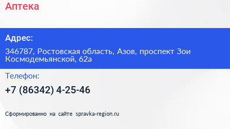 Аптека по адресу 346787, Ростовская область, Азов, проспект Зои Космодемьянской, 62а в дальнейшем Организация, размещена в следующих категориях: