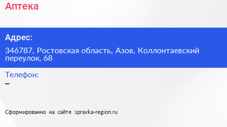 Аптека по адресу 346787, Ростовская область, Азов, Коллонтаевский переулок, 68 в дальнейшем Организация, размещена в следующих категориях: