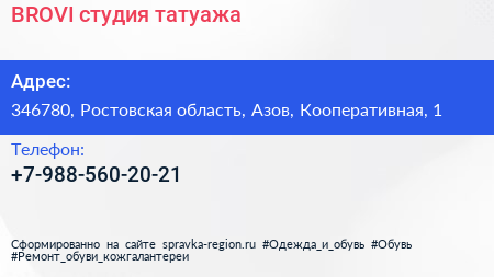 BROVI, студия татуажа по адресу 346780, Ростовская область, Азов, Кооперативная, 1 в дальнейшем Организация, размещена в следующих категориях: