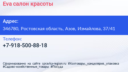 Eva, салон красоты по адресу 346780, Ростовская область, Азов, Измайлова, 37/41 в дальнейшем Организация, размещена в следующих категориях: