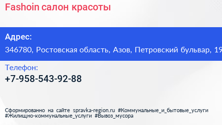 Fashoin, салон красоты по адресу 346780, Ростовская область, Азов, Петровский бульвар, 19 в дальнейшем Организация, размещена в следующих категориях: