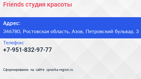 Friends, студия красоты по адресу 346780, Ростовская область, Азов, Петровский бульвар, 3 в дальнейшем Организация, размещена в следующих категориях: