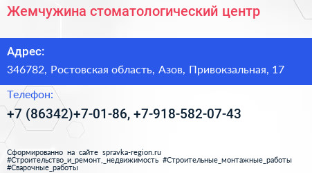 Жемчужина, стоматологический центр по адресу 346782, Ростовская область, Азов, Привокзальная, 17 в дальнейшем Организация, размещена в следующих категориях: