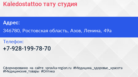 Kaledostattoo, тату-студия по адресу 346780, Ростовская область, Азов, Ленина, 49а в дальнейшем Организация, размещена в следующих категориях: