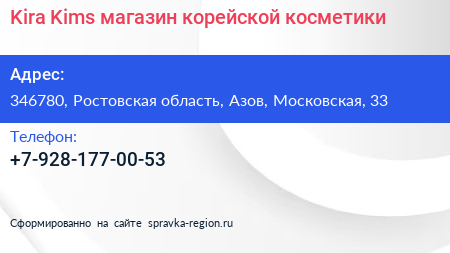 Kira Kims, магазин корейской косметики по адресу 346780, Ростовская область, Азов, Московская, 33 в дальнейшем Организация, размещена в следующих категориях: