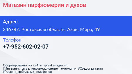 Магазин парфюмерии и духов по адресу 346787, Ростовская область, Азов, Мира, 49 в дальнейшем Организация, размещена в следующих категориях: