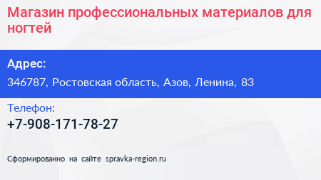 Магазин профессиональных материалов для ногтей по адресу 346787, Ростовская область, Азов, Ленина, 83 в дальнейшем Организация, размещена в следующих категориях: